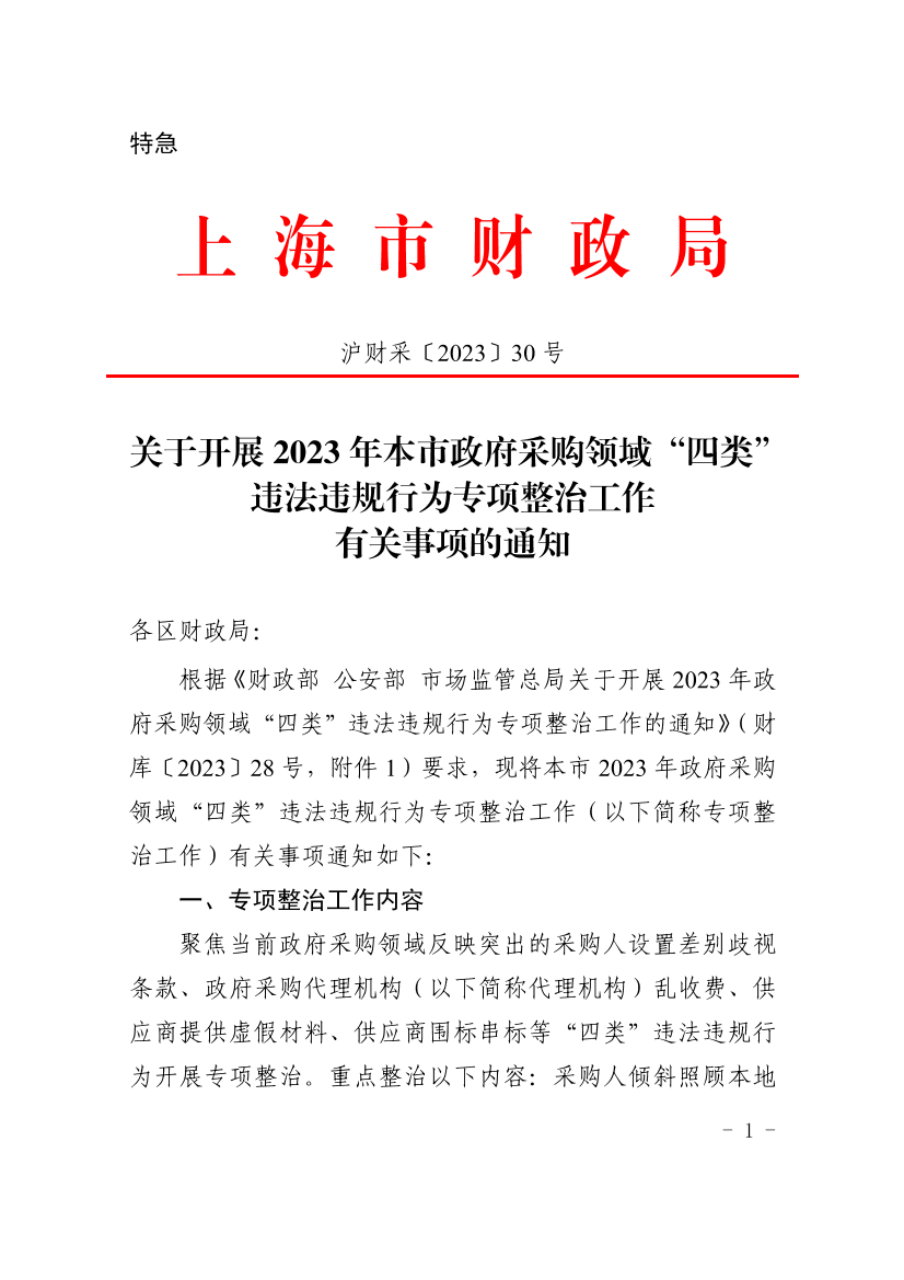 根据《财政部 公安部 市场监管总局关于开展2023年政府采购领域“四类”违法违规行为专项整治工作的通知》(财库〔2023〕28号,附件1)要求,现将本市2023年政府采购领域“四类”违法违规行为专项整治工作(以下简称专项整治工作)有关事项通知如下: