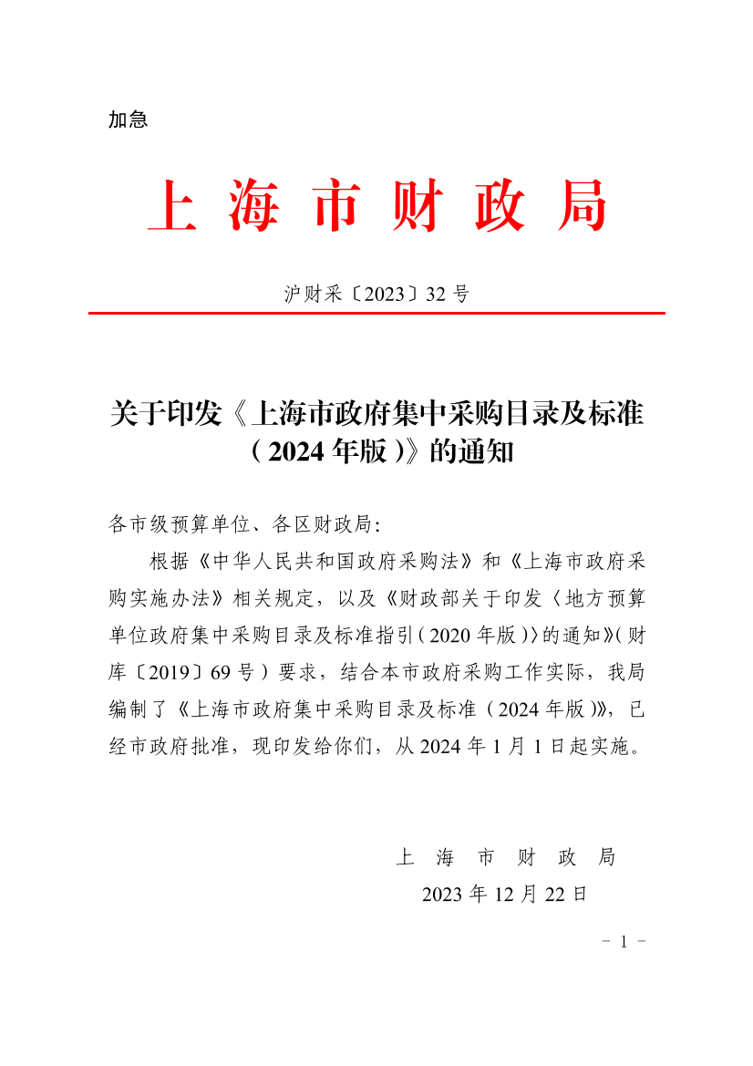 根据《中华人民共和国政府采购法》和《上海市政府采购实施办法》相关规定,以及《财政部关于印发〈地方预算单位政府集中采购目录及标准指引(2020年版)〉的通知》(财库〔2019〕69号)要求,结合本市政府采购工作实际,我局编制了《上海市政府集中采购目录及标准(2024年版)》,已经市政府批准,现印发给你们,从2024年1月1日起实施。