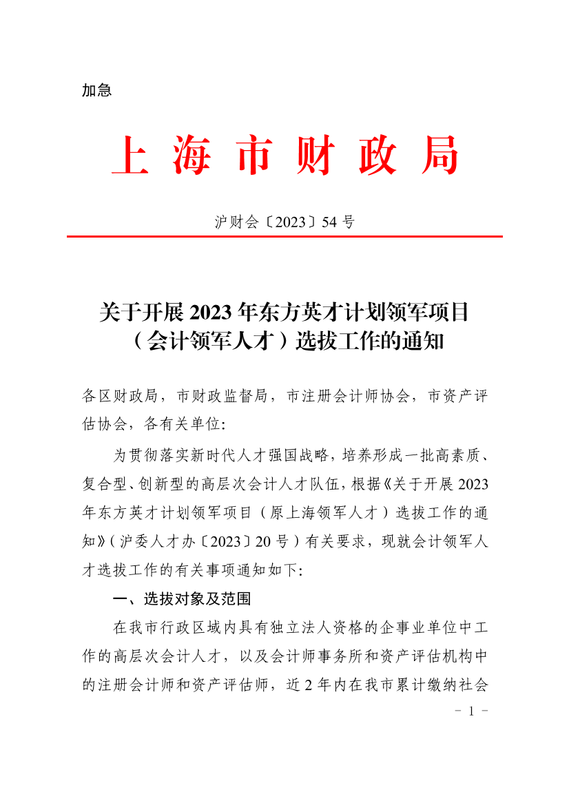 为贯彻落实新时代人才强国战略,培养形成一批高素质、复合型、创新型的高层次会计人才队伍,根据《关于开展2023年东方英才计划领军项目(原上海领军人才)选拔工作的通知》(沪委人才办〔2023〕20号)有关要求,现就会计领军人才选拔工作的有关事项通知如下: