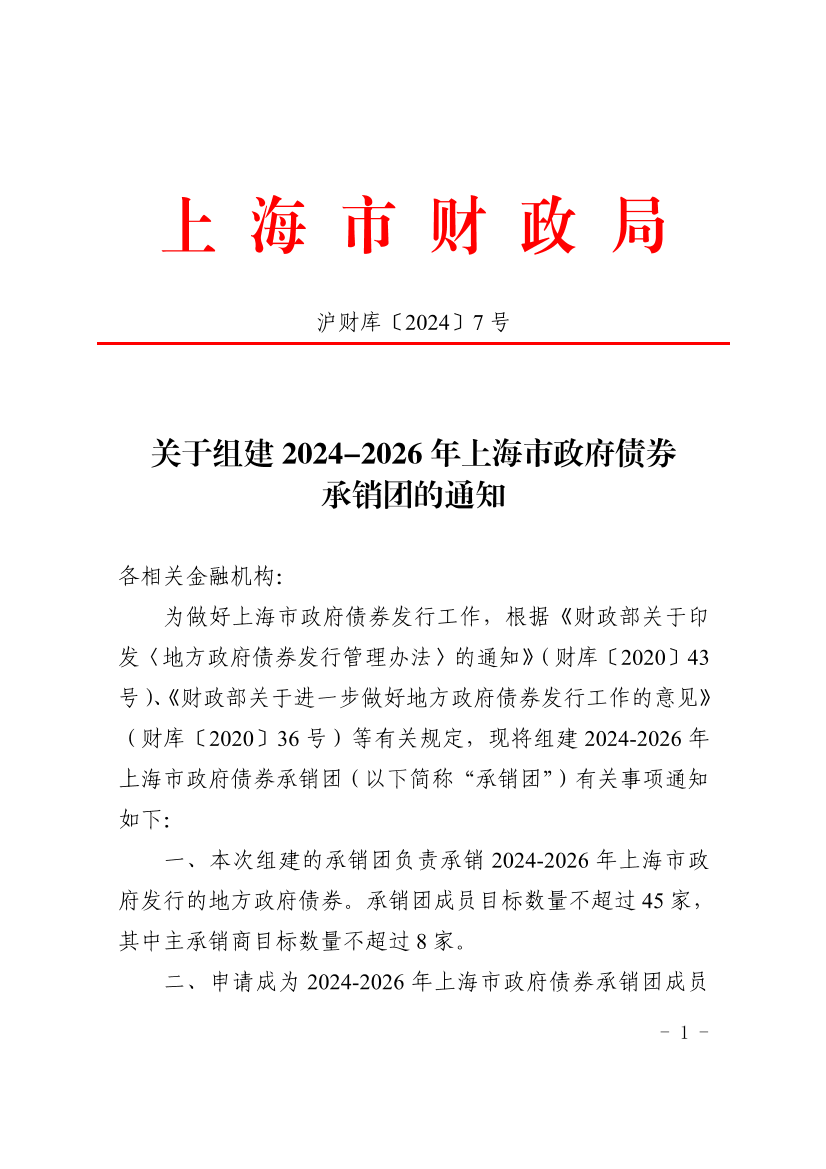 为做好上海市政府债券发行工作,根据《财政部关于印发〈地方政府债券发行管理办法〉的通知》(财库〔2020〕43号)、《财政部关于进一步做好地方政府债券发行工作的意见》(财库〔2020〕36号)等有关规定,现将组建2024-2026年上海市政府债券承销团(以下简称“承销团”)有关事项通知如下: