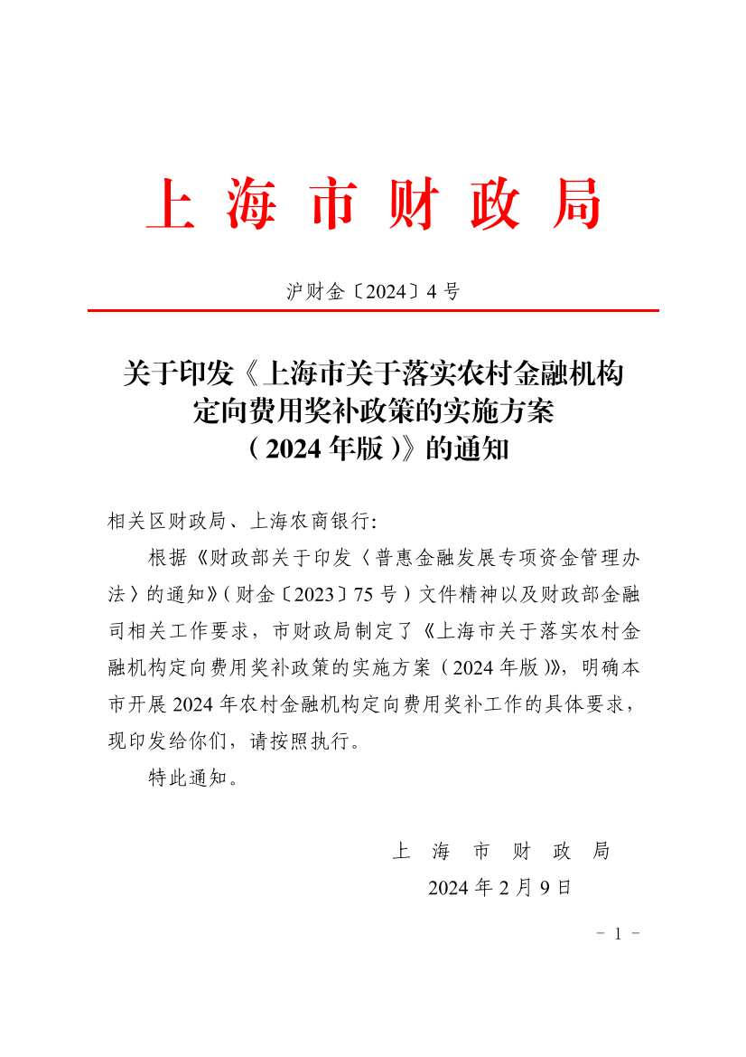 根据《财政部关于印发〈普惠金融发展专项资金管理办法〉的通知》(财金〔2023〕75号)文件精神以及财政部金融司相关工作要求,市财政局制定了《上海市关于落实农村金融机构定向费用奖补政策的实施方案(2024年版)》,明确本市开展2024年农村金融机构定向费用奖补工作的具体要求,现印发给你们,请按照执行。