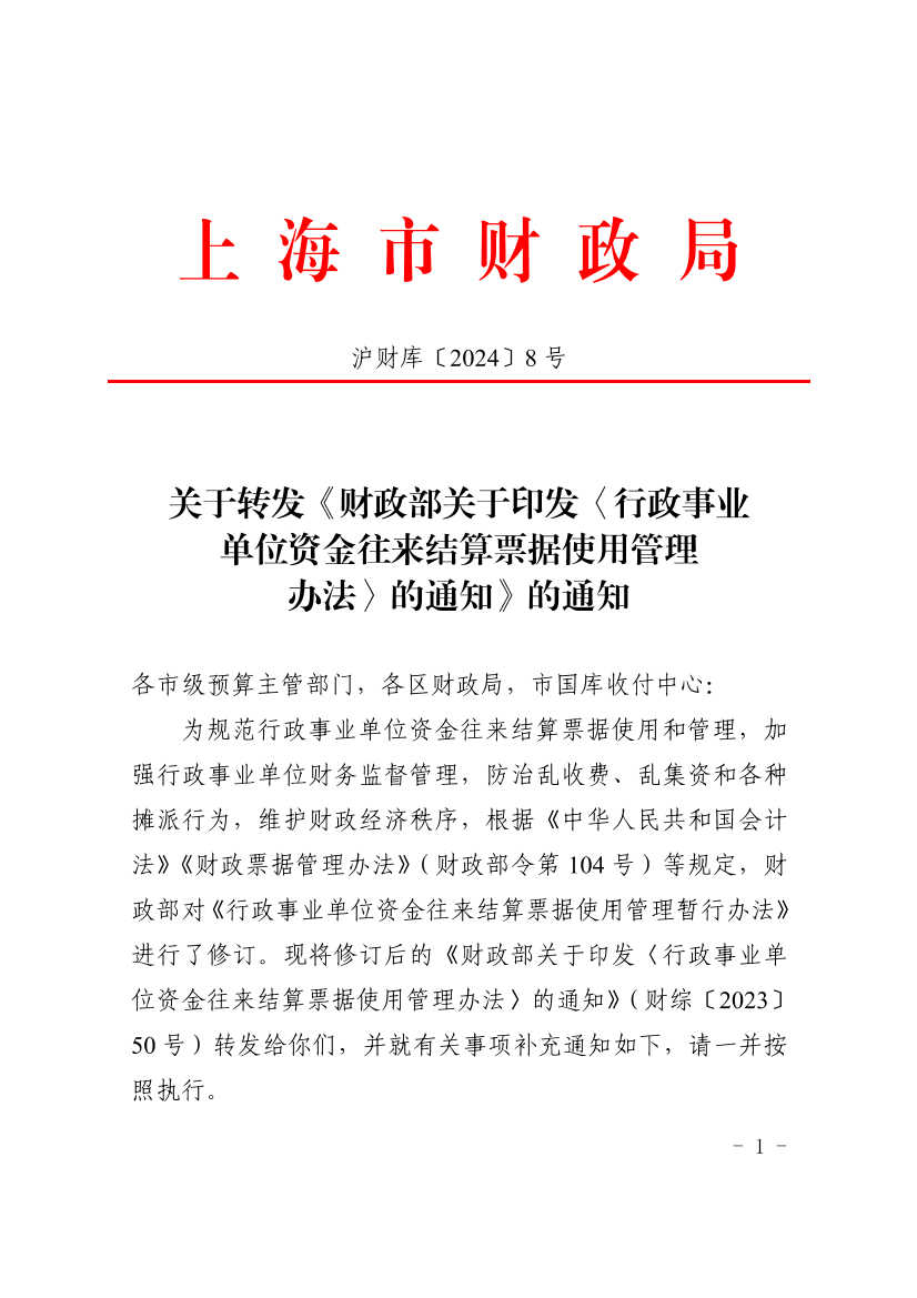 为规范行政事业单位资金往来结算票据使用和管理,加强行政事业单位财务监督管理,防治乱收费、乱集资和各种摊派行为,维护财政经济秩序,根据《中华人民共和国会计法》《财政票据管理办法》(财政部令第104号)等规定,财政部对《行政事业单位资金往来结算票据使用管理暂行办法》进行了修订。现将修订后的《财政部关于印发〈行政事业单位资金往来结算票据使用管理办法〉的通知》(财综〔2023〕50号)转发给你们,并就有关事项补充通知如下,请一并按照执行。