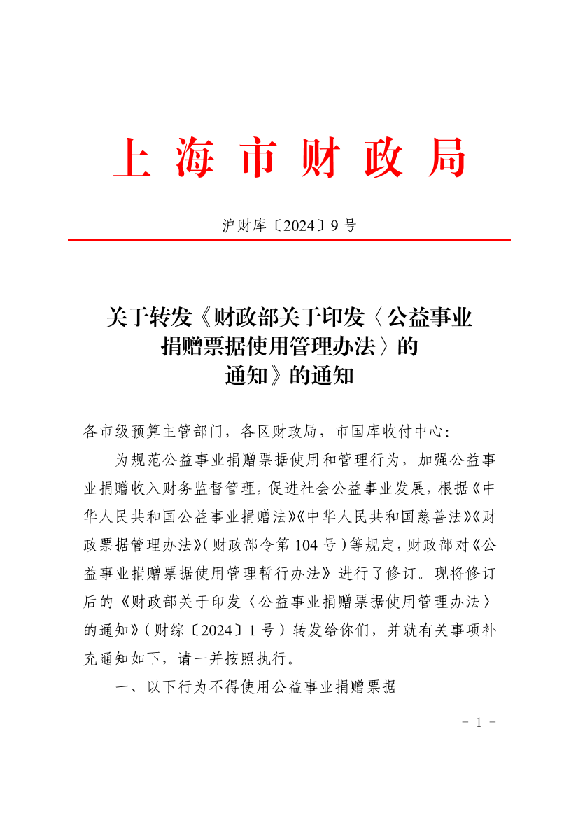 为规范公益事业捐赠票据使用和管理行为,加强公益事业捐赠收入财务监督管理,促进社会公益事业发展,根据《中华人民共和国公益事业捐赠法》《中华人民共和国慈善法》《财政票据管理办法》(财政部令第104号)等规定,财政部对《公益事业捐赠票据使用管理暂行办法》进行了修订。现将修订后的《财政部关于印发〈公益事业捐赠票据使用管理办法〉的通知》(财综〔2024〕1号)转发给你们,并就有关事项补充通知如下,请一并按照执行。