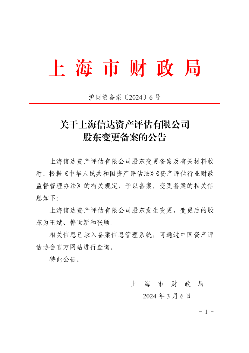 上海信达资产评估有限公司股东变更备案及有关材料收悉。根据《中华人民共和国资产评估法》《资产评估行业财政监督管理办法》的有关规定,予以备案。变更备案的相关信息如下:
