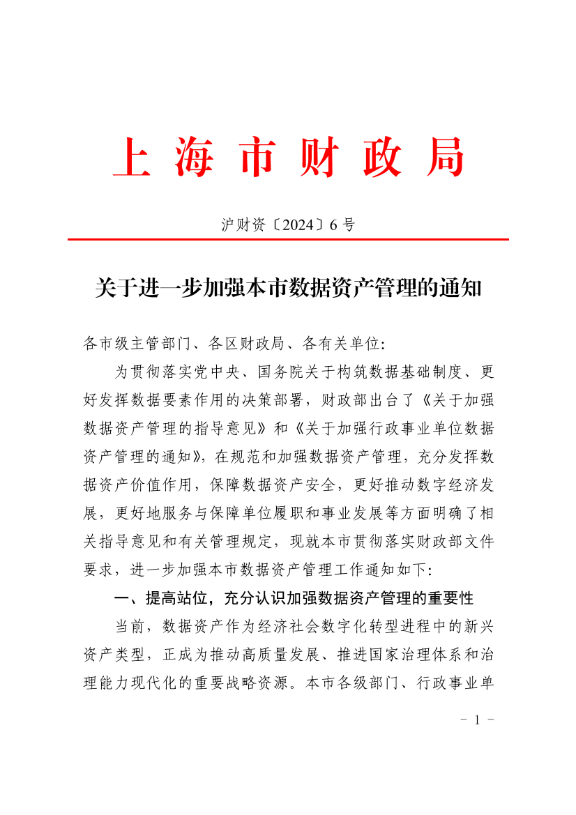 为贯彻落实党中央、国务院关于构筑数据基础制度、更好发挥数据要素作用的决策部署,财政部出台了《关于加强数据资产管理的指导意见》和《关于加强行政事业单位数据资产管理的通知》,在规范和加强数据资产管理,充分发挥数据资产价值作用,保障数据资产安全,更好推动数字经济发展,更好地服务与保障单位履职和事业发展等方面明确了相关指导意见和有关管理规定,现就本市贯彻落实财政部文件要求,进一步加强本市数据资产管理工作通知如下: