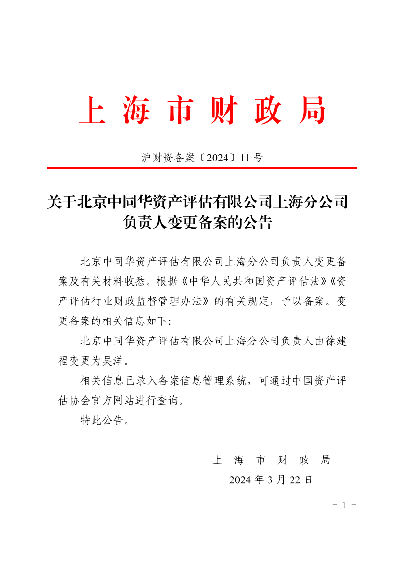 北京中同华资产评估有限公司上海分公司负责人变更备案及有关材料收悉。根据《中华人民共和国资产评估法》《资产评估行业财政监督管理办法》的有关规定,予以备案。变更备案的相关信息如下: