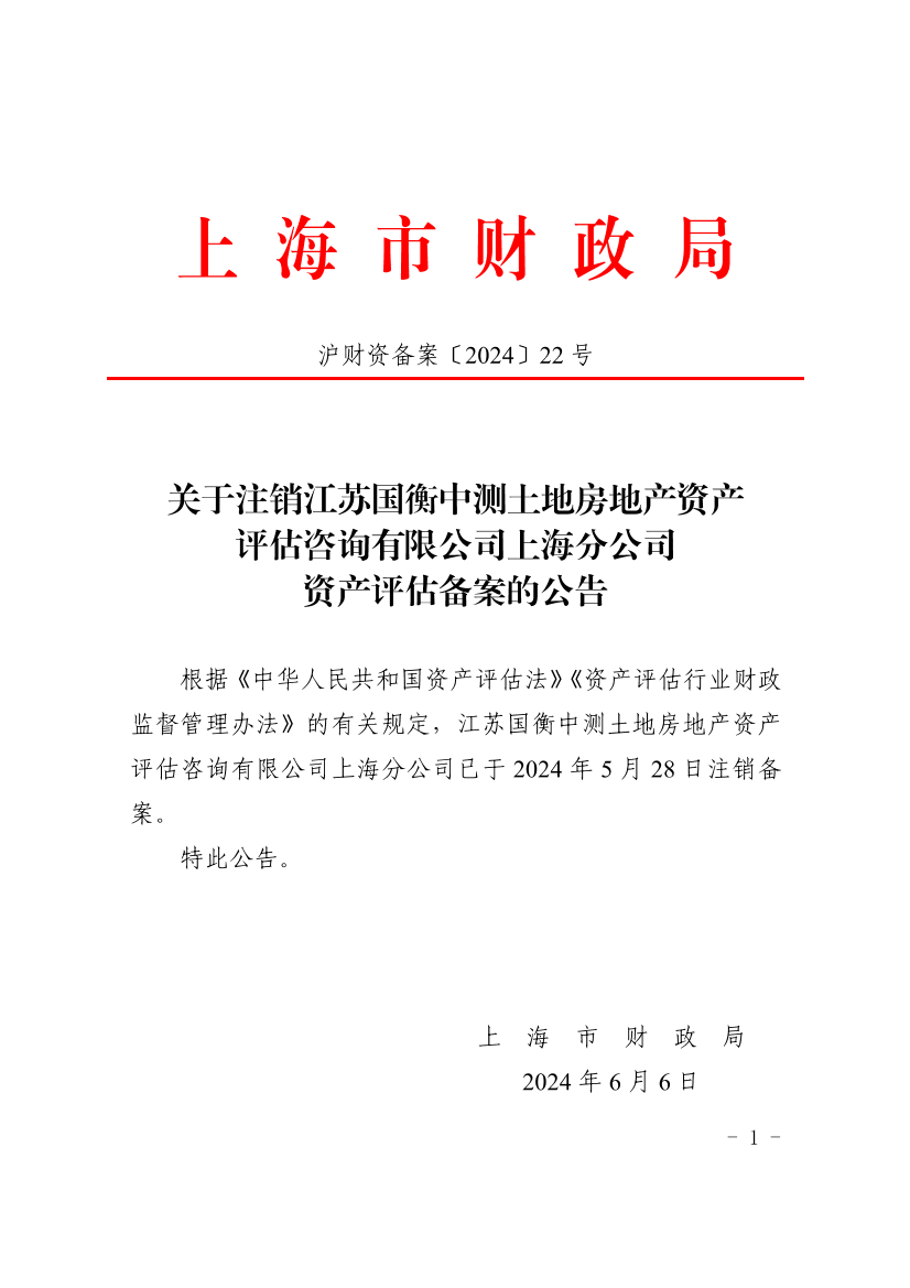 根据《中华人民共和国资产评估法》《资产评估行业财政监督管理办法》的有关规定,江苏国衡中测土地房地产资产评估咨询有限公司上海分公司已于2024年5月28日注销备案。