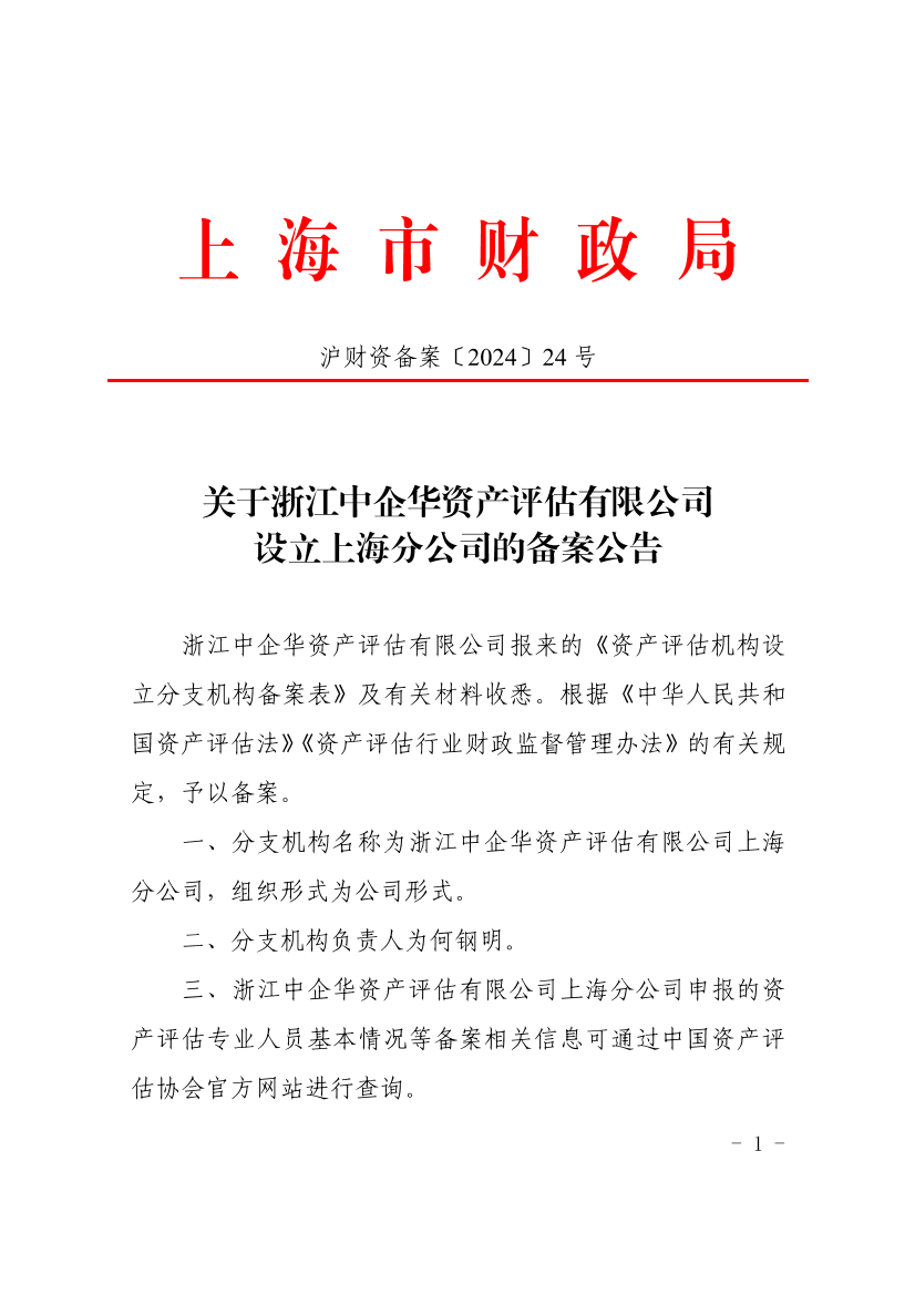 浙江中企华资产评估有限公司报来的《资产评估机构设立分支机构备案表》及有关材料收悉。根据《中华人民共和国资产评估法》《资产评估行业财政监督管理办法》的有关规定,予以备案。
