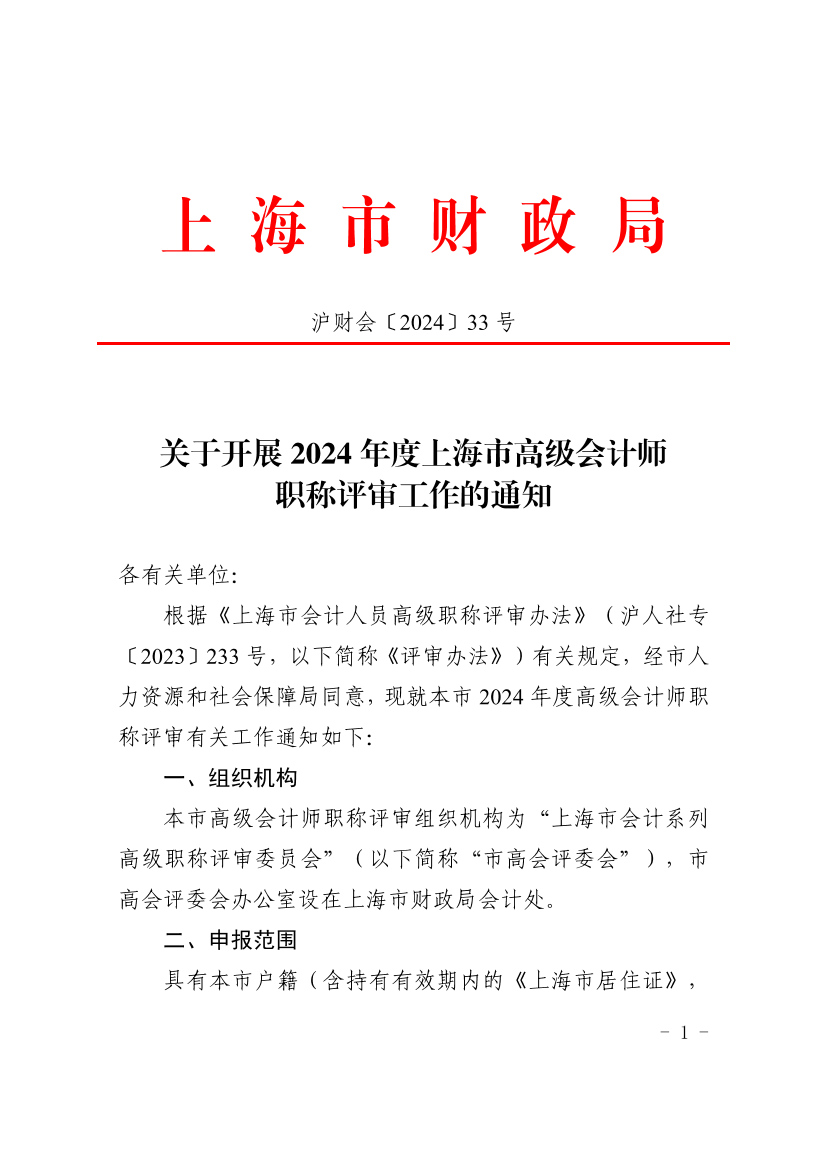 根据《上海市会计人员高级职称评审办法》(沪人社专〔2023〕233号,以下简称《评审办法》)有关规定,经市人力资源和社会保障局同意,现就本市2024年度高级会计师职称评审有关工作通知如下: