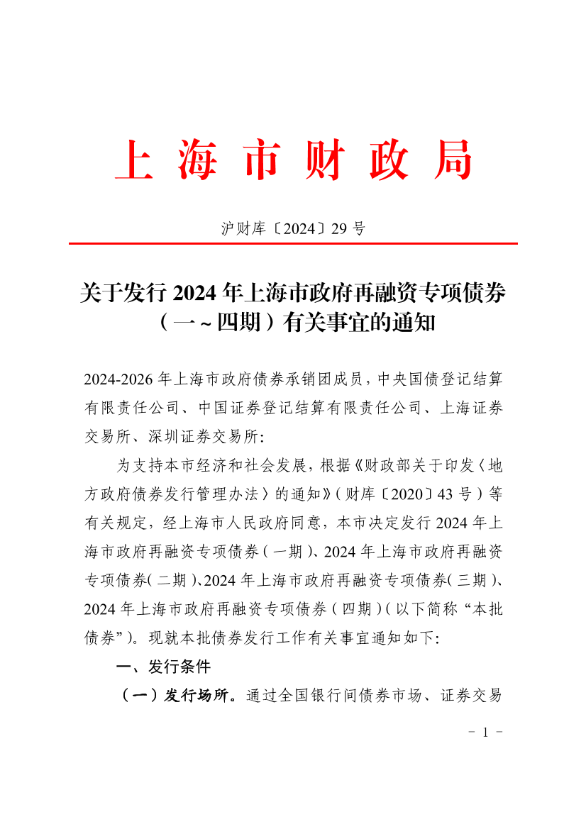 为支持本市经济和社会发展,根据《财政部关于印发〈地方政府债券发行管理办法〉的通知》(财库〔2020〕43号)等有关规定,经上海市人民政府同意,本市决定发行2024年上海市政府再融资专项债券(一期)、2024年上海市政府再融资专项债券(二期)、2024年上海市政府再融资专项债券(三期)、2024年上海市政府再融资专项债券(四期)(以下简称“本批债券”)。现就本批债券发行工作有关事宜通知如下: