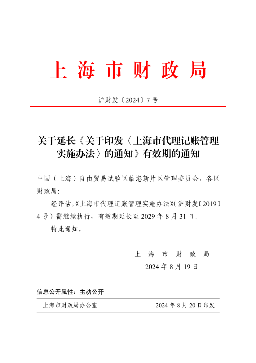 经评估,《上海市代理记账管理实施办法》(沪财发〔2019〕4号)需继续执行,有效期延长至2029年8月31日。