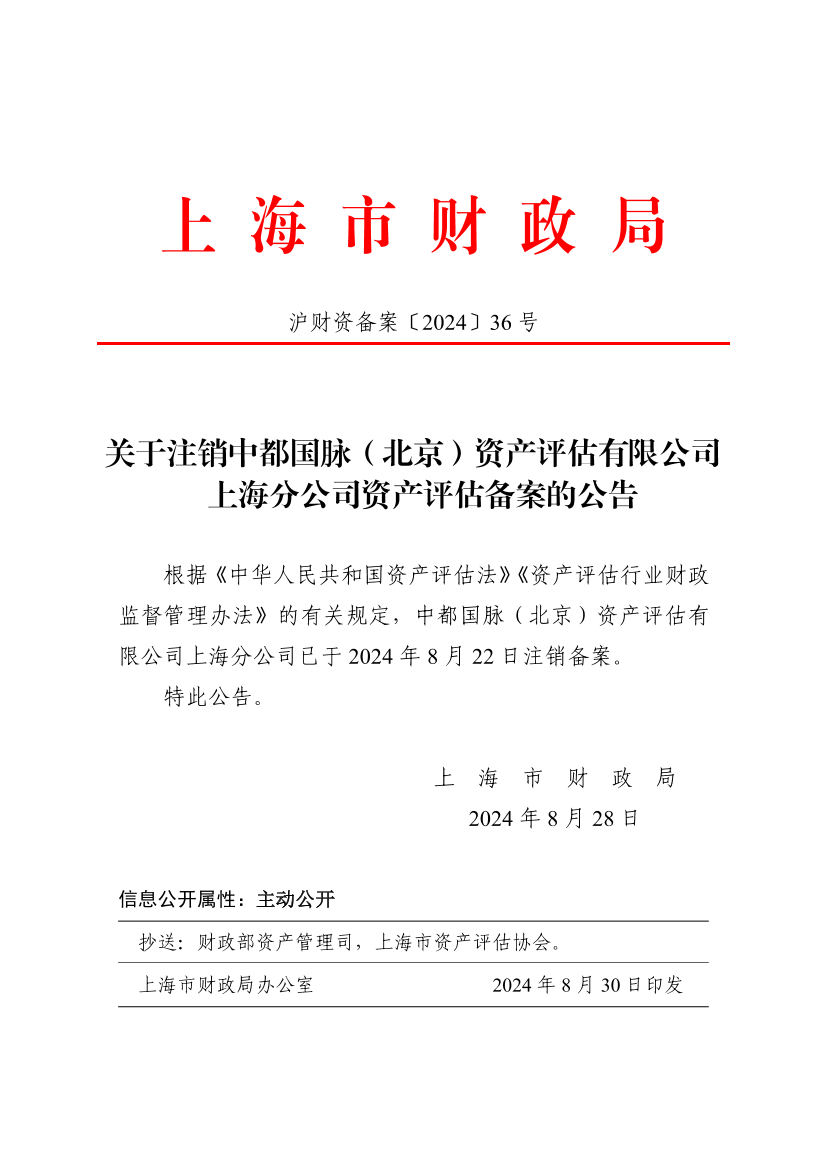 根据《中华人民共和国资产评估法》《资产评估行业财政监督管理办法》的有关规定,中都国脉(北京)资产评估有限公司上海分公司已于2024年8月22日注销备案。