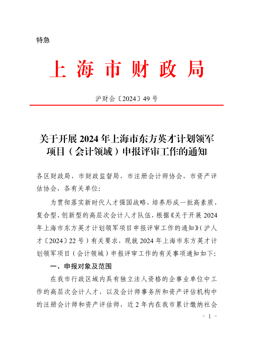 为贯彻落实新时代人才强国战略,培养形成一批高素质、复合型、创新型的高层次会计人才队伍,根据《关于开展2024年上海市东方英才计划领军项目申报评审工作的通知》(沪人才〔2024〕22号)有关要求,现就2024年上海市东方英才计划领军项目(会计领域)申报评审工作的有关事项通知如下: