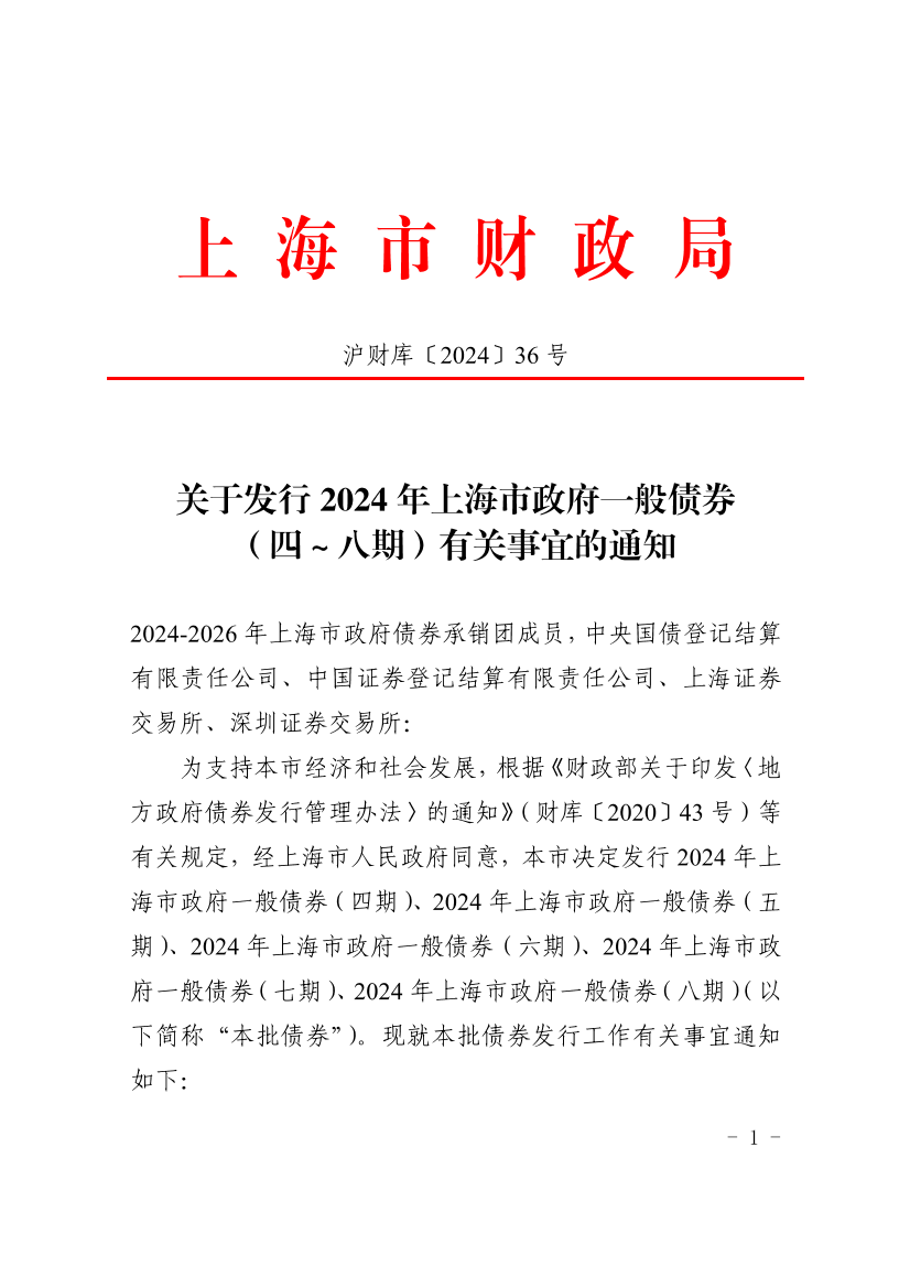 为支持本市经济和社会发展,根据《财政部关于印发〈地方政府债券发行管理办法〉的通知》(财库〔2020〕43号)等有关规定,经上海市人民政府同意,本市决定发行2024年上海市政府一般债券(四期)、2024年上海市政府一般债券(五期)、2024年上海市政府一般债券(六期)、2024年上海市政府一般债券(七期)、2024年上海市政府一般债券(八期)(以下简称“本批债券”)。现就本批债券发行工作有关事宜通知如下: