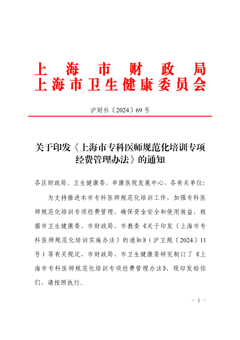 为支持推进本市专科医师规范化培训工作,加强专科医师规范化培训专项经费管理,确保资金安全和使用效益,根据市卫生健康委、市财政局、市教委《关于印发〈上海市专科医师规范化培训实施办法〉的通知》(沪卫规〔2024〕11号)等有关规定,市财政局、市卫生健康委研究制订了《上海市专科医师规范化培训专项经费管理办法》,现印发给你们,请按照执行。