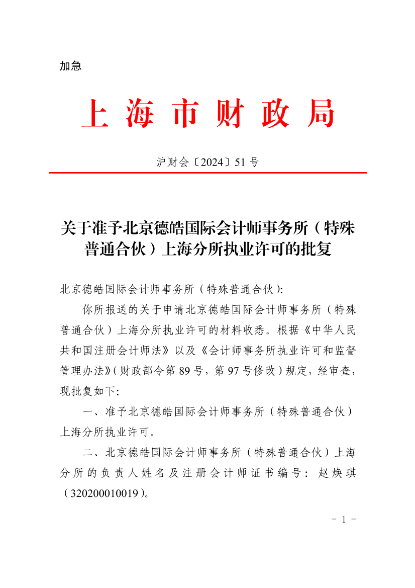你所报送的关于申请北京德皓国际会计师事务所(特殊普通合伙)上海分所执业许可的材料收悉。根据《中华人民共和国注册会计师法》以及《会计师事务所执业许可和监督管理办法》(财政部令第89号,第97号修改)规定,经审查,现批复如下: