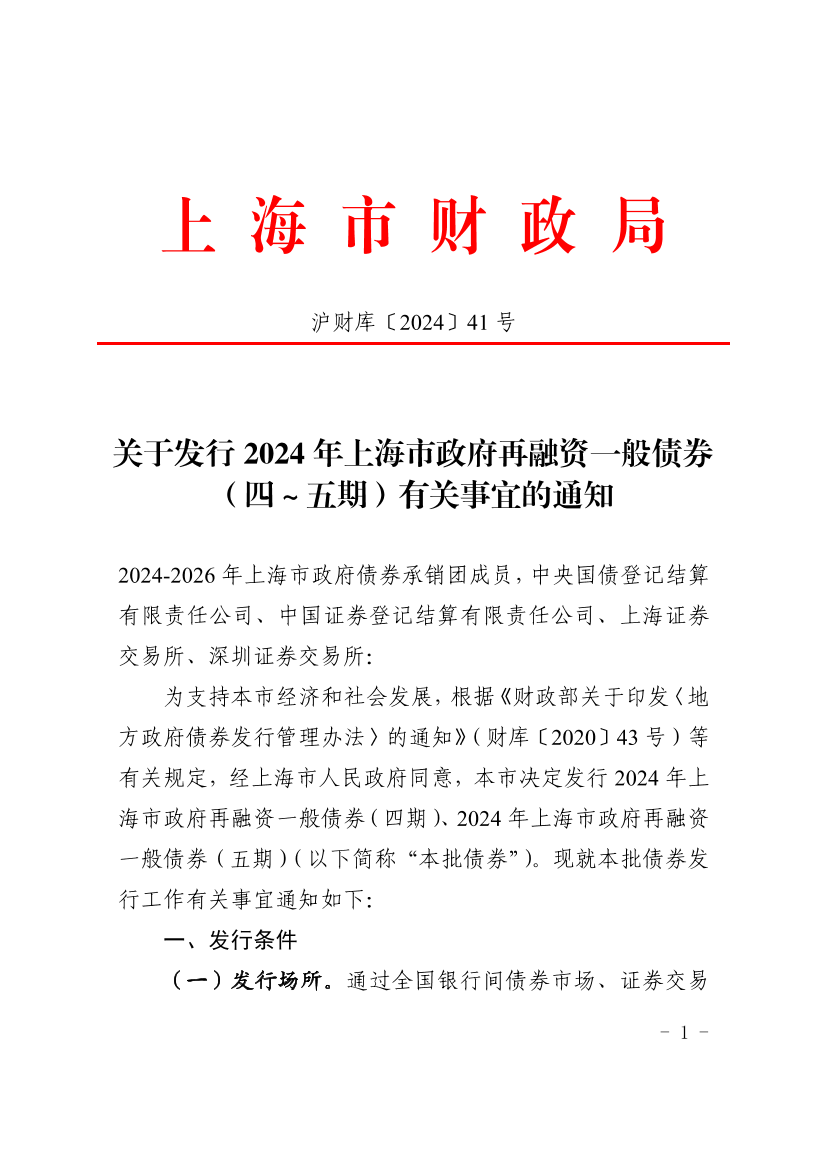 为支持本市经济和社会发展,根据《财政部关于印发〈地方政府债券发行管理办法〉的通知》(财库〔2020〕43号)等有关规定,经上海市人民政府同意,本市决定发行2024年上海市政府再融资一般债券(四期)、2024年上海市政府再融资一般债券(五期)(以下简称“本批债券”)。现就本批债券发行工作有关事宜通知如下: