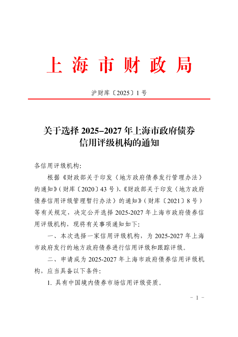 根据《财政部关于印发〈地方政府债券发行管理办法〉的通知》(财库〔2020〕43号)、《财政部关于印发〈地方政府债券信用评级管理暂行办法〉的通知》(财库〔2021〕8号)等有关规定,决定公开选择2025-2027年上海市政府债券信用评级机构,现将有关事项通知如下: