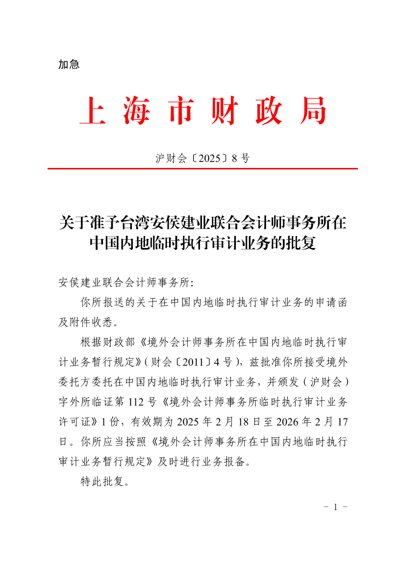根据财政部《境外会计师事务所在中国内地临时执行审计业务暂行规定》(财会〔2011〕4号),兹批准你所接受境外委托方委托在中国内地临时执行审计业务,并颁发(沪财会)字外所临证第112号《境外会计师事务所临时执行审计业务许可证》1份,有效期为2025年2月18日至2026年2月17日。你所应当按照《境外会计师事务所在中国内地临时执行审计业务暂行规定》及时进行业务报备。
