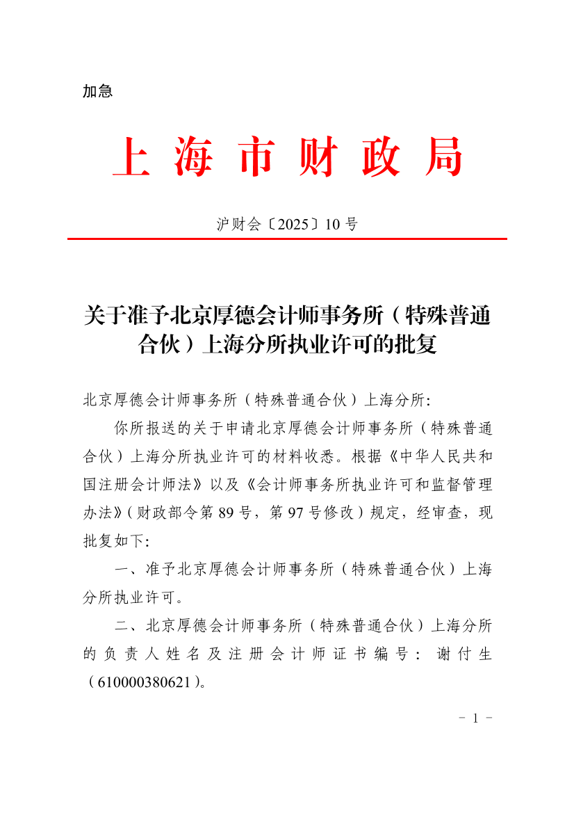 你所报送的关于申请北京厚德会计师事务所(特殊普通合伙)上海分所执业许可的材料收悉。根据《中华人民共和国注册会计师法》以及《会计师事务所执业许可和监督管理办法》(财政部令第89号,第97号修改)规定,经审查,现批复如下:
