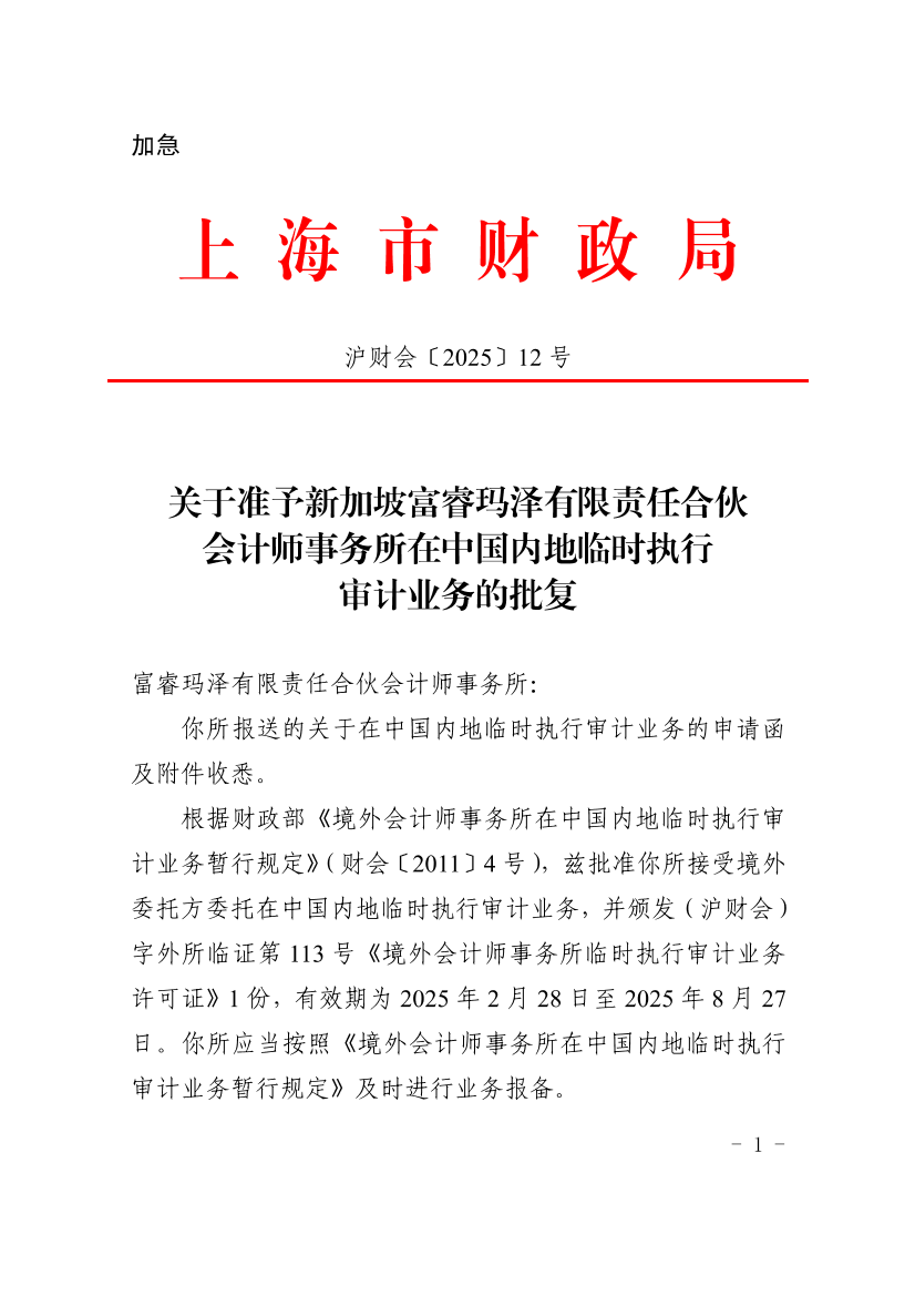 根据财政部《境外会计师事务所在中国内地临时执行审计业务暂行规定》(财会〔2011〕4号),兹批准你所接受境外委托方委托在中国内地临时执行审计业务,并颁发(沪财会)字外所临证第113号《境外会计师事务所临时执行审计业务许可证》1份,有效期为2025年2月28日至2025年8月27日。你所应当按照《境外会计师事务所在中国内地临时执行审计业务暂行规定》及时进行业务报备。