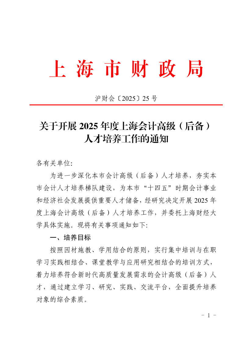 为进一步深化本市会计高级(后备)人才培养,夯实本市会计人才培养梯队建设,为本市“十四五”时期会计事业和经济社会发展提供重要人才储备,经研究决定开展2025年度上海会计高级(后备)人才培养工作,并委托上海财经大学具体实施。现将有关事项通知如下: