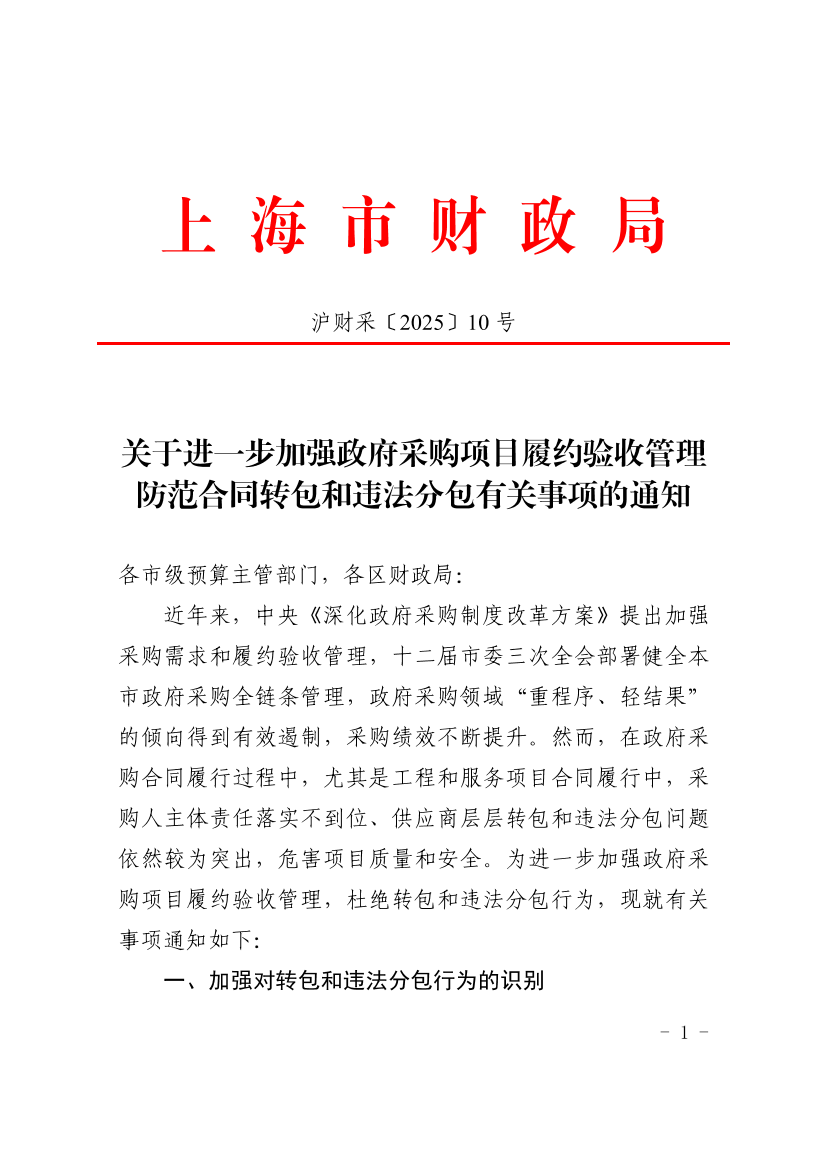近年来,中央《深化政府采购制度改革方案》提出加强采购需求和履约验收管理,十二届市委三次全会部署健全本市政府采购全链条管理,政府采购领域“重程序、轻结果”的倾向得到有效遏制,采购绩效不断提升。然而,在政府采购合同履行过程中,尤其是工程和服务项目合同履行中,采购人主体责任落实不到位、供应商层层转包和违法分包问题依然较为突出,危害项目质量和安全。为进一步加强政府采购项目履约验收管理,杜绝转包和违法分包行为,现就有关事项通知如下: