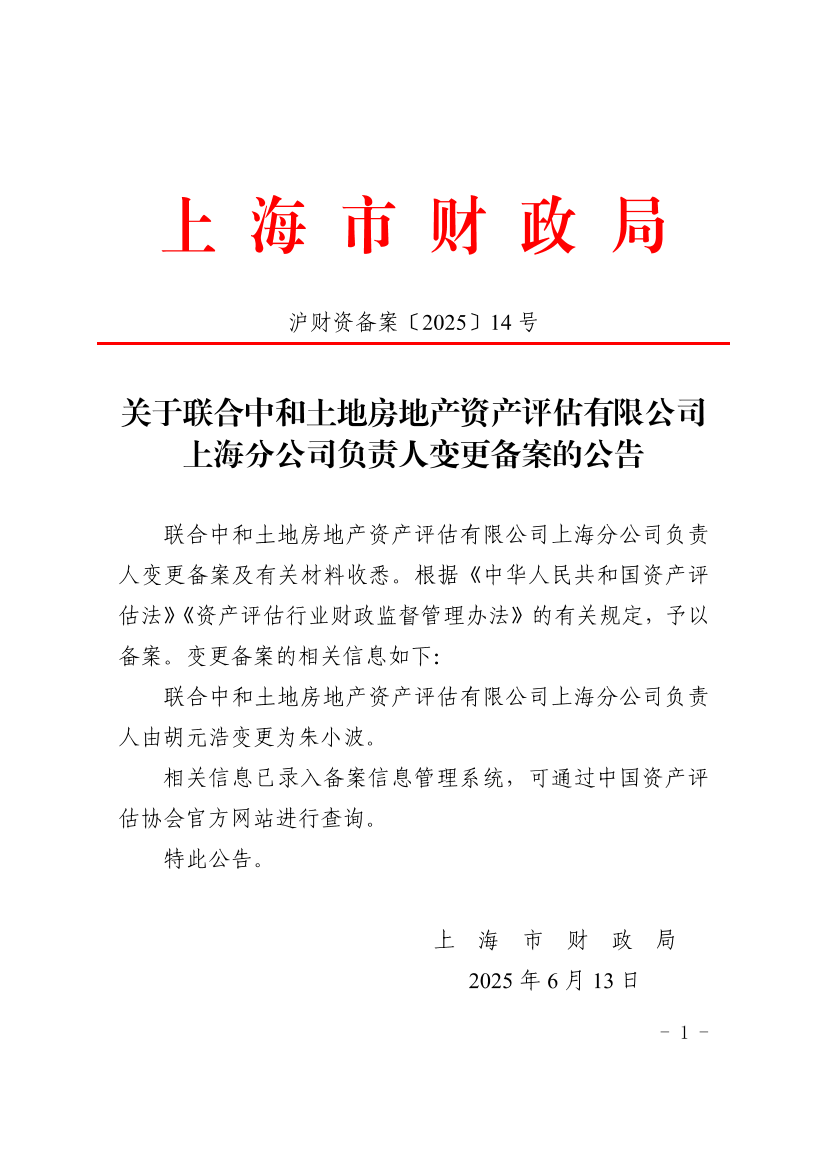 联合中和土地房地产资产评估有限公司上海分公司负责人变更备案及有关材料收悉。根据《中华人民共和国资产评估法》《资产评估行业财政监督管理办法》的有关规定,予以备案。变更备案的相关信息如下: