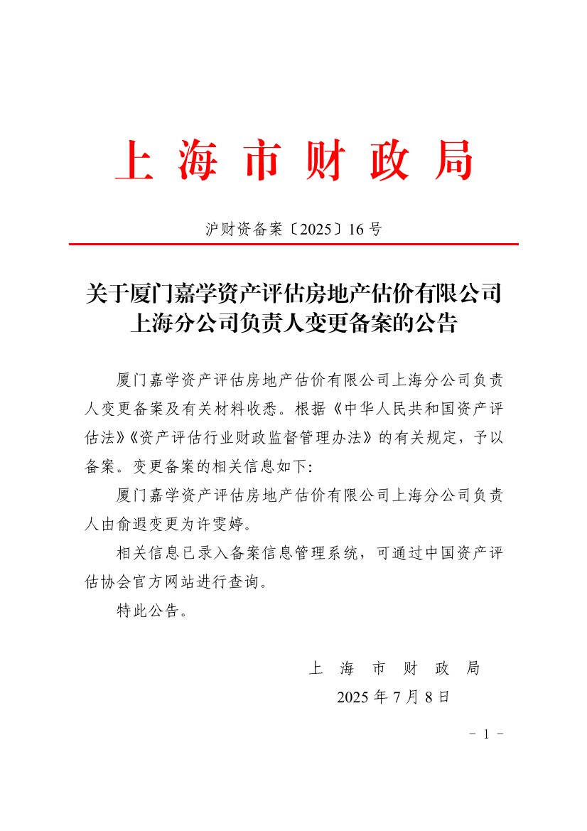 厦门嘉学资产评估房地产估价有限公司上海分公司负责人变更备案及有关材料收悉。根据《中华人民共和国资产评估法》《资产评估行业财政监督管理办法》的有关规定,予以备案。变更备案的相关信息如下:
