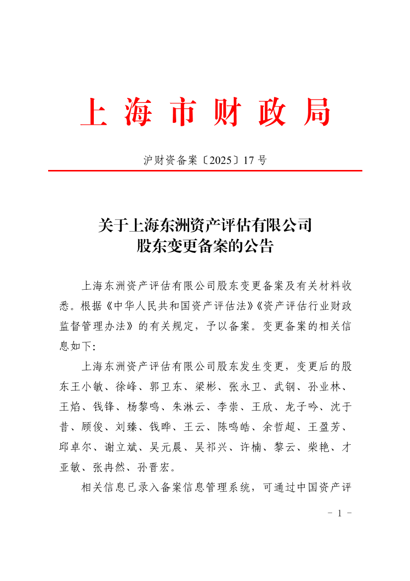 上海东洲资产评估有限公司股东变更备案及有关材料收悉。根据《中华人民共和国资产评估法》《资产评估行业财政监督管理办法》的有关规定,予以备案。变更备案的相关信息如下: