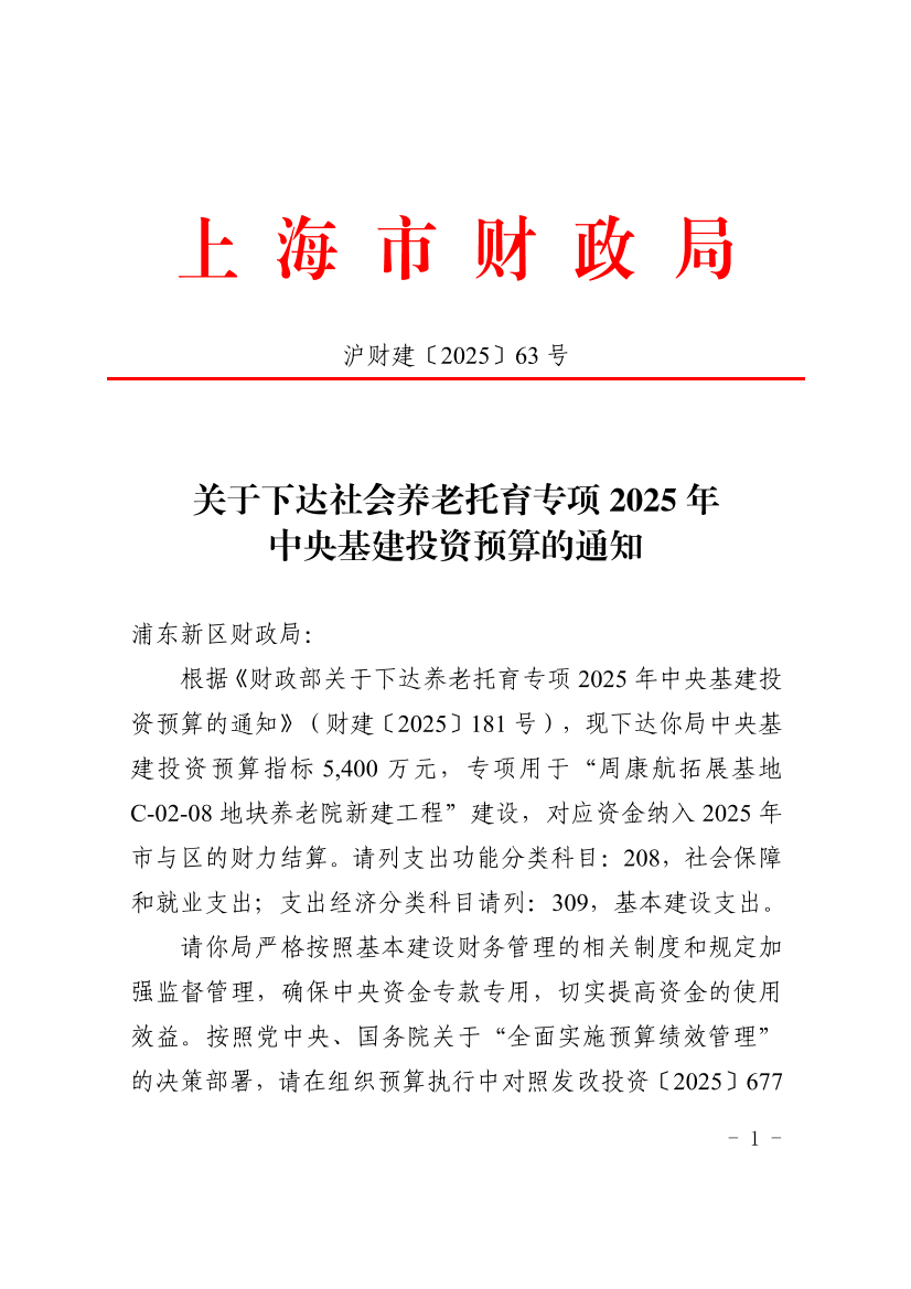 根据《财政部关于下达养老托育专项2025年中央基建投资预算的通知》(财建〔2025〕181号),现下达你局中央基建投资预算指标5,400万元,专项用于“周康航拓展基地C-02-08地块养老院新建工程”建设,对应资金纳入2025年市与区的财力结算。请列支出功能分类科目:208,社会保障和就业支出;支出经济分类科目请列:309,基本建设支出。