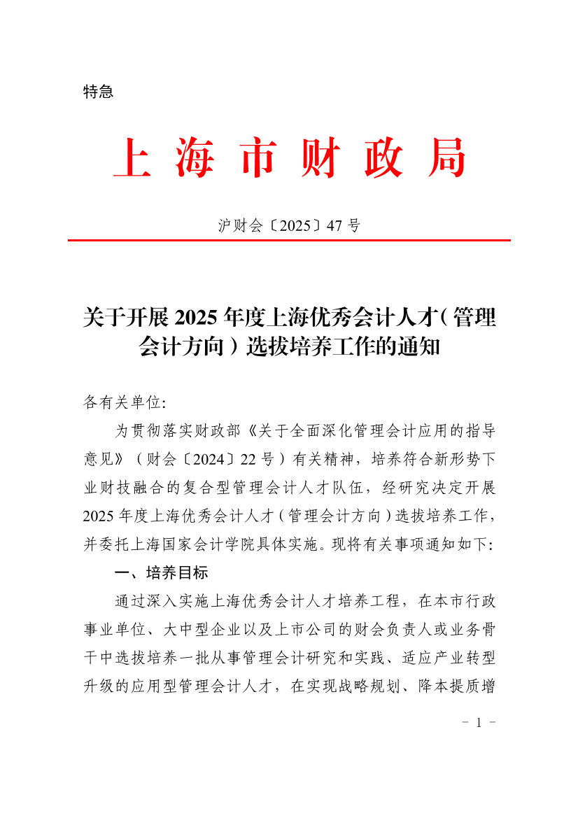 为贯彻落实财政部《关于全面深化管理会计应用的指导意见》(财会〔2024〕22号)有关精神,培养符合新形势下业财技融合的复合型管理会计人才队伍,经研究决定开展2025年度上海优秀会计人才(管理会计方向)选拔培养工作,并委托上海国家会计学院具体实施。现将有关事项通知如下: