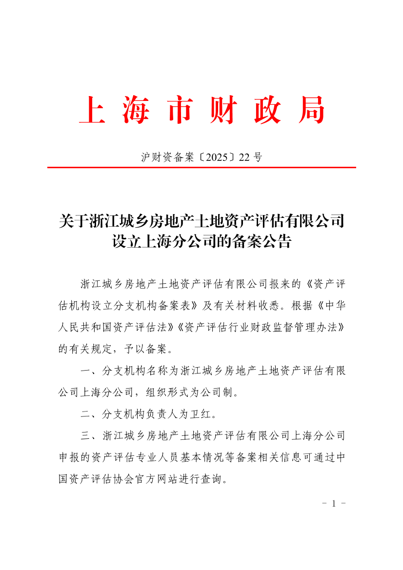 浙江城乡房地产土地资产评估有限公司报来的《资产评估机构设立分支机构备案表》及有关材料收悉。根据《中华人民共和国资产评估法》《资产评估行业财政监督管理办法》的有关规定,予以备案。