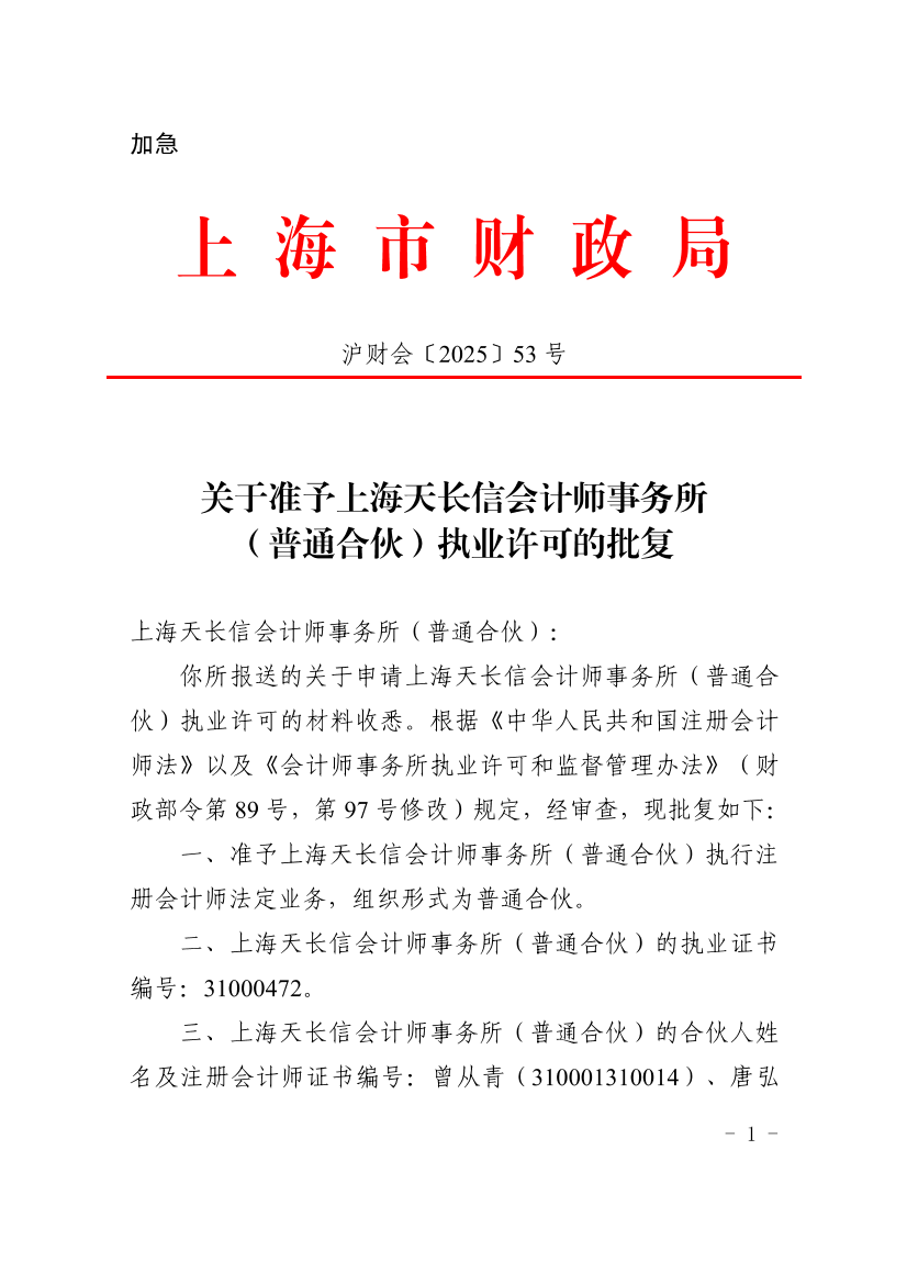 一、准予上海天长信会计师事务所(普通合伙)执行注册会计师法定业务,组织形式为普通合伙。