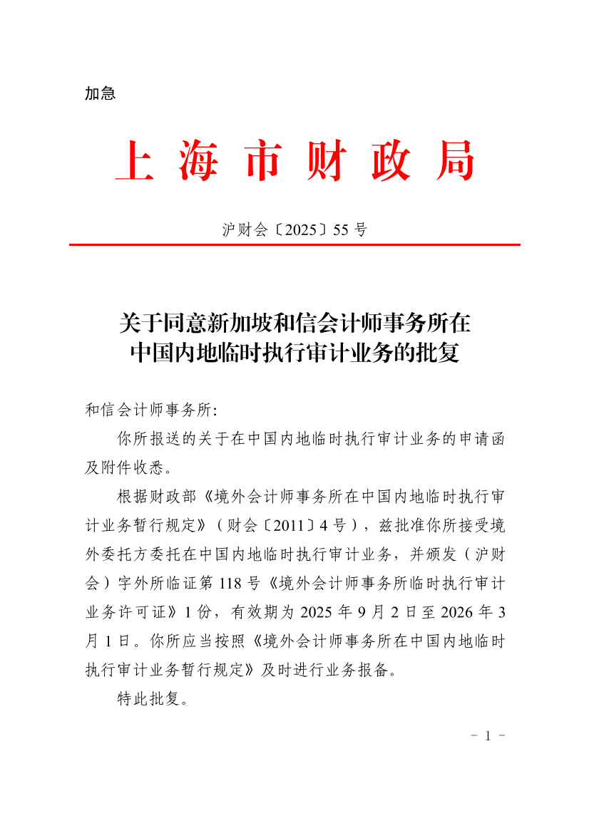 根据财政部《境外会计师事务所在中国内地临时执行审计业务暂行规定》(财会〔2011〕4号),兹批准你所接受境外委托方委托在中国内地临时执行审计业务,并颁发(沪财会)字外所临证第118号《境外会计师事务所临时执行审计业务许可证》1份,有效期为2025年9月2日至2026年3月1日。你所应当按照《境外会计师事务所在中国内地临时执行审计业务暂行规定》及时进行业务报备。