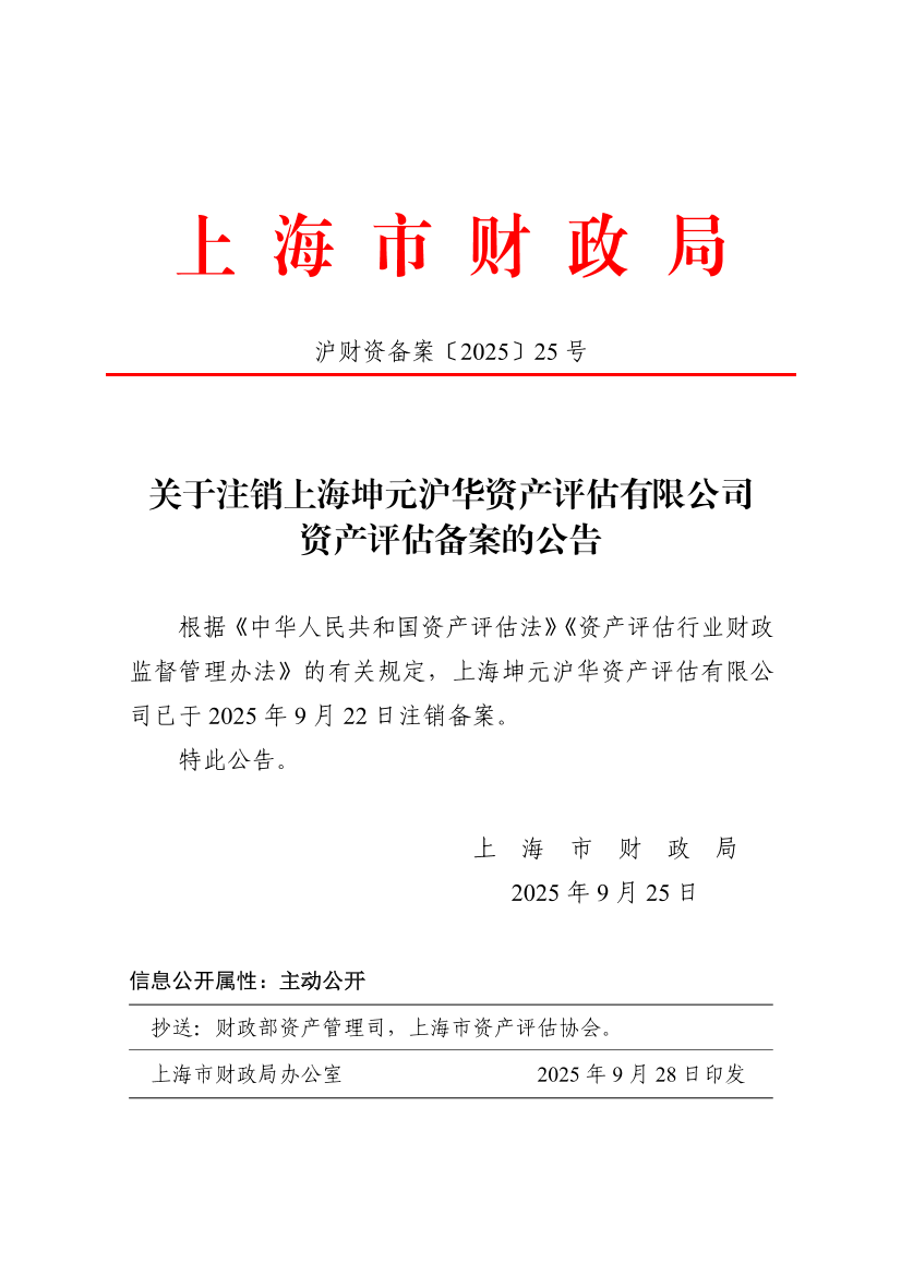 根据《中华人民共和国资产评估法》《资产评估行业财政监督管理办法》的有关规定,上海坤元沪华资产评估有限公司已于2025年9月22日注销备案。