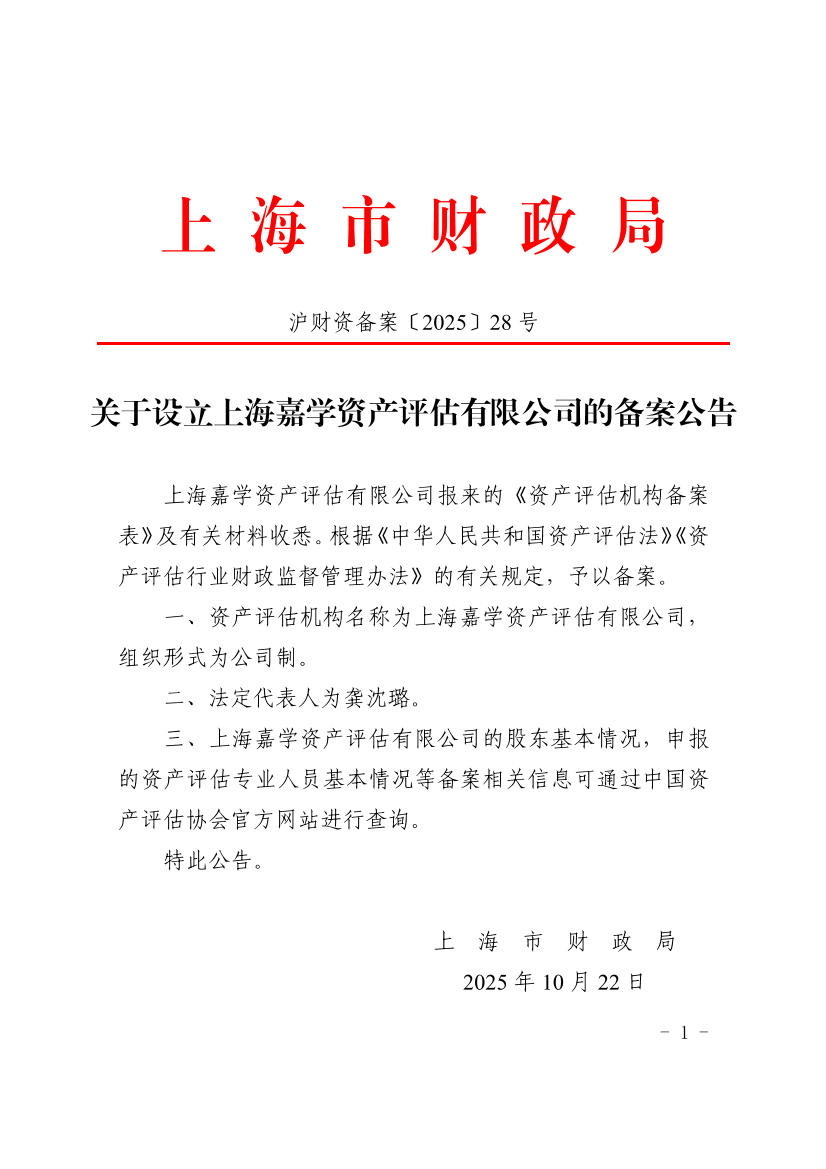 上海嘉学资产评估有限公司报来的《资产评估机构备案表》及有关材料收悉。根据《中华人民共和国资产评估法》《资产评估行业财政监督管理办法》的有关规定,予以备案。