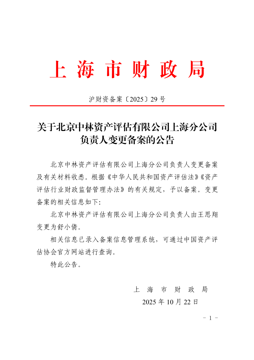 北京中林资产评估有限公司上海分公司负责人变更备案及有关材料收悉。根据《中华人民共和国资产评估法》《资产评估行业财政监督管理办法》的有关规定,予以备案。变更备案的相关信息如下: