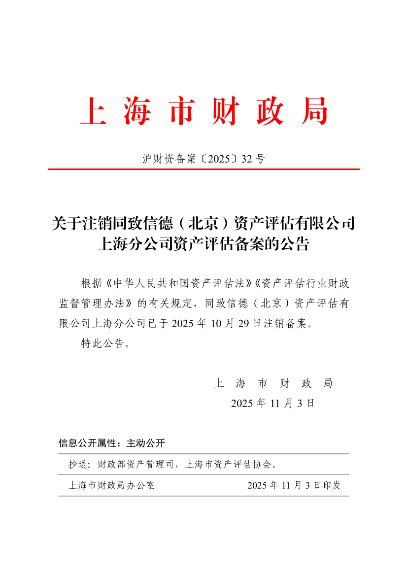 根据《中华人民共和国资产评估法》《资产评估行业财政监督管理办法》的有关规定,同致信德(北京)资产评估有限公司上海分公司已于2025年10月29日注销备案。