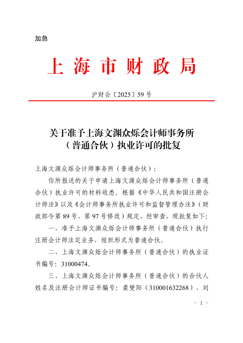 你所报送的关于申请上海文渊众烁会计师事务所(普通合伙)执业许可的材料收悉。根据《中华人民共和国注册会计师法》以及《会计师事务所执业许可和监督管理办法》(财政部令第89号,第97号修改)规定,经审查,现批复如下: