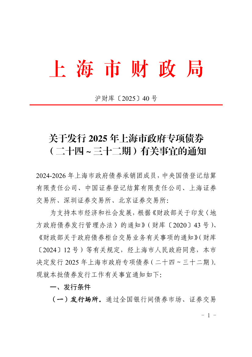 为支持本市经济和社会发展,根据《财政部关于印发〈地方政府债券发行管理办法〉的通知》(财库〔2020〕43号)、《财政部关于政府债券柜台交易业务有关事项的通知》(财库〔2024〕12号)等有关规定,经上海市人民政府同意,本市决定发行2025年上海市政府专项债券(二十四~三十二期)。现就本批债券发行工作有关事宜通知如下: