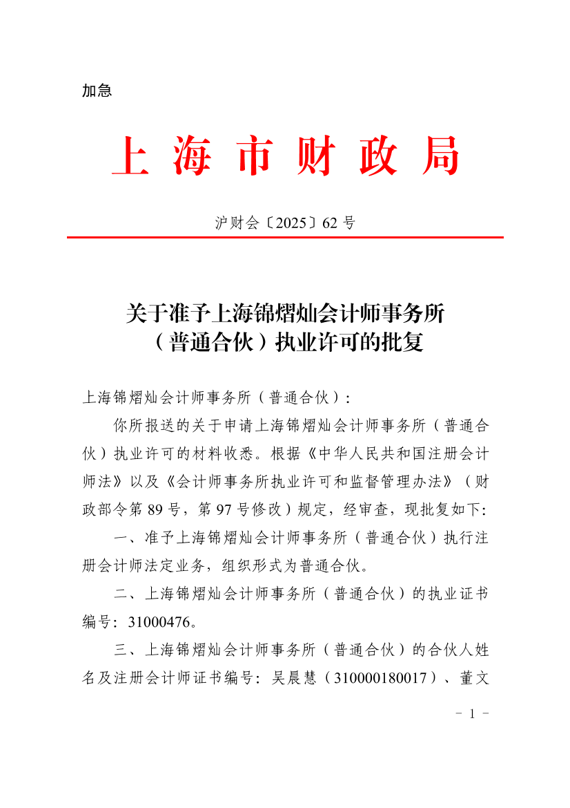 一、准予上海锦熠灿会计师事务所(普通合伙)执行注册会计师法定业务,组织形式为普通合伙。