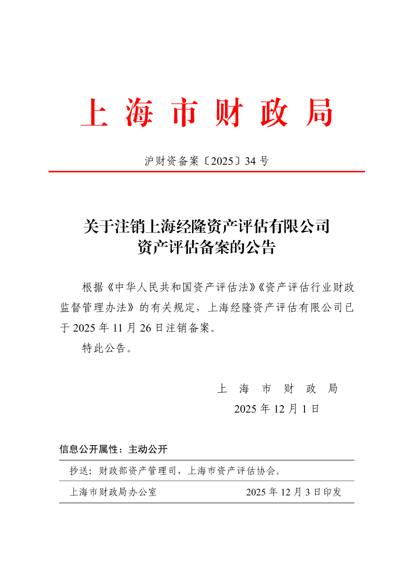 根据《中华人民共和国资产评估法》《资产评估行业财政监督管理办法》的有关规定,上海经隆资产评估有限公司已于2025年11月26日注销备案。