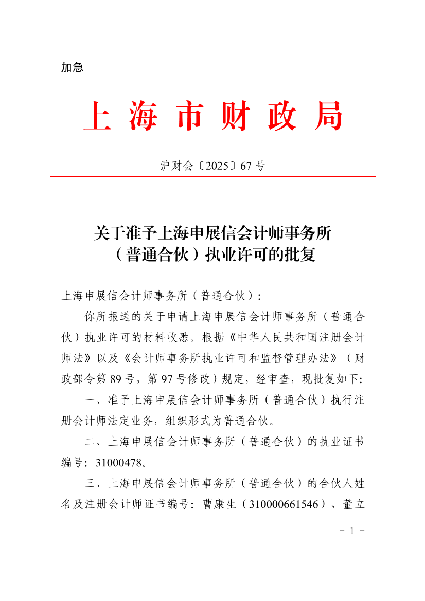一、准予上海申展信会计师事务所(普通合伙)执行注册会计师法定业务,组织形式为普通合伙。