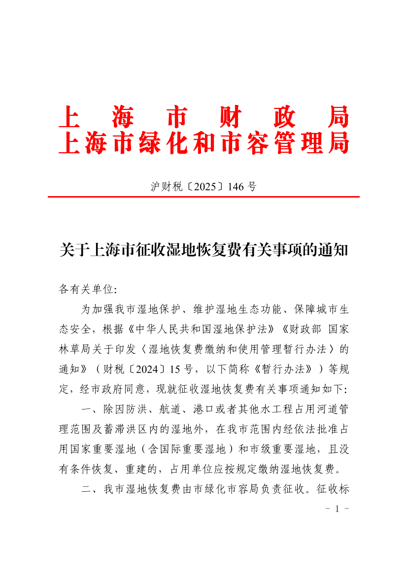 为加强我市湿地保护、维护湿地生态功能、保障城市生态安全,根据《中华人民共和国湿地保护法》《财政部 国家林草局关于印发〈湿地恢复费缴纳和使用管理暂行办法〉的通知》(财税〔2024〕15号,以下简称《暂行办法》)等规定,经市政府同意,现就征收湿地恢复费有关事项通知如下: