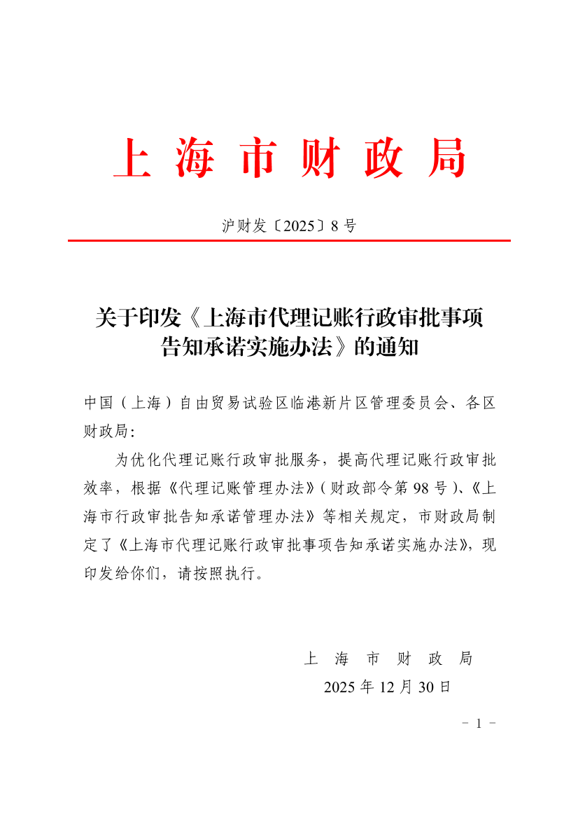为优化代理记账行政审批服务,提高代理记账行政审批效率,根据《代理记账管理办法》(财政部令第98号)、《上海市行政审批告知承诺管理办法》等相关规定,市财政局制定了《上海市代理记账行政审批事项告知承诺实施办法》,现印发给你们,请按照执行。