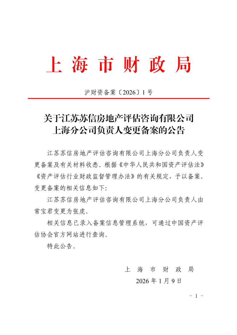 江苏苏信房地产评估咨询有限公司上海分公司负责人变更备案及有关材料收悉。根据《中华人民共和国资产评估法》《资产评估行业财政监督管理办法》的有关规定,予以备案。变更备案的相关信息如下: