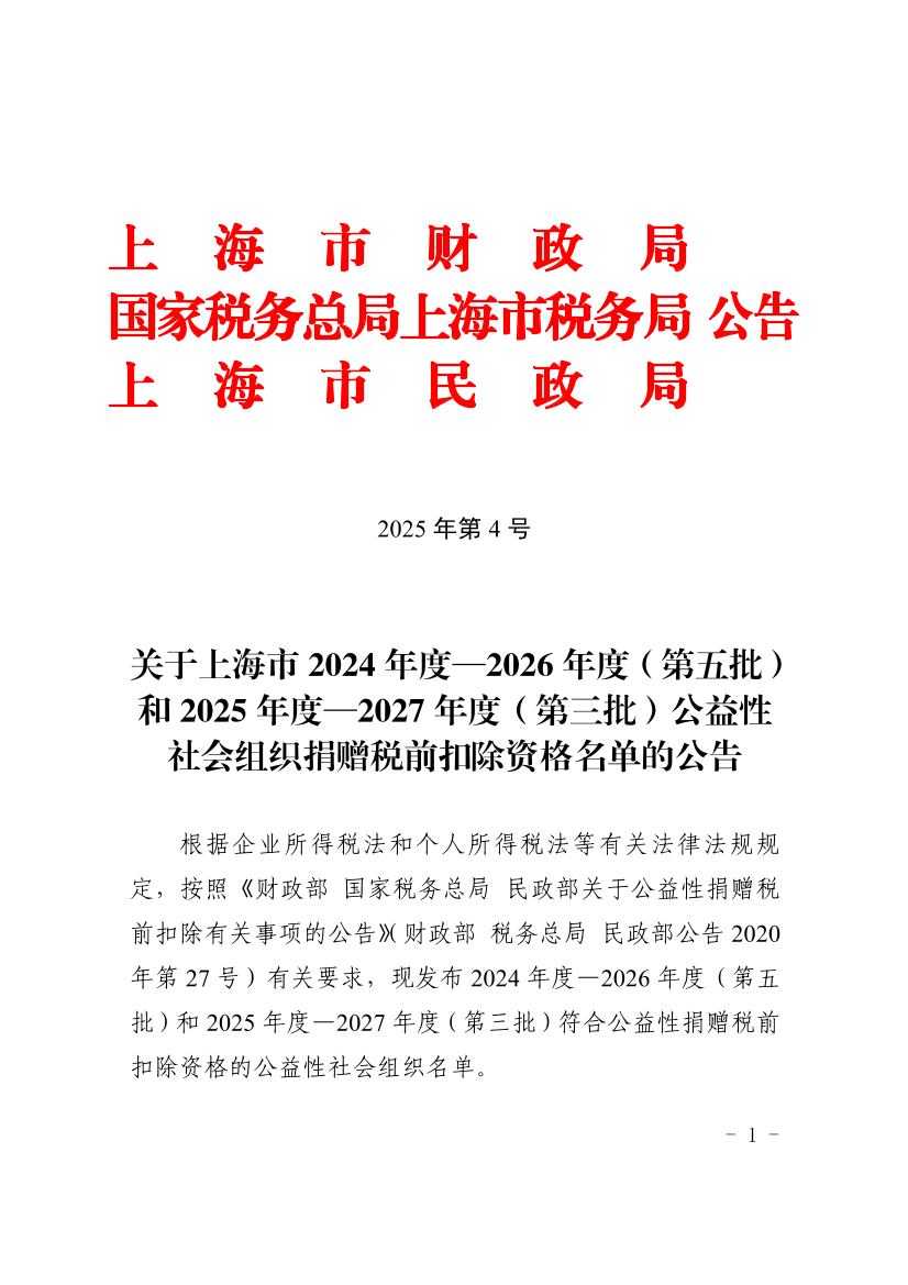 上海市2024年度—2026年度(第五批)和2025年度—2027年度(第三批)符合公益性捐赠税前扣除资格的公益性社会组织名单
