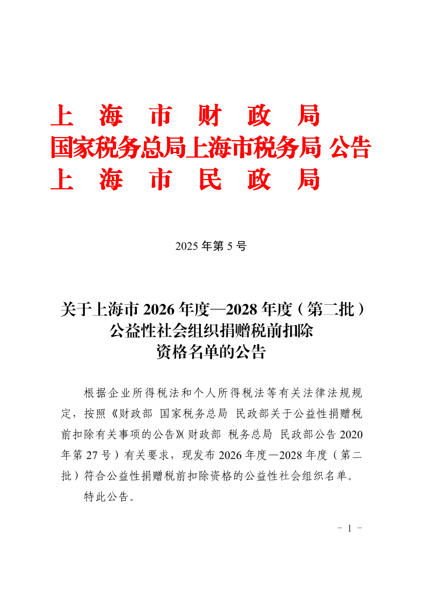 根据企业所得税法和个人所得税法等有关法律法规规定,按照《财政部 国家税务总局 民政部关于公益性捐赠税前扣除有关事项的公告》(财政部 税务总局 民政部公告2020年第27号)有关要求,现发布2026年度—2028年度(第二批)符合公益性捐赠税前扣除资格的公益性社会组织名单。