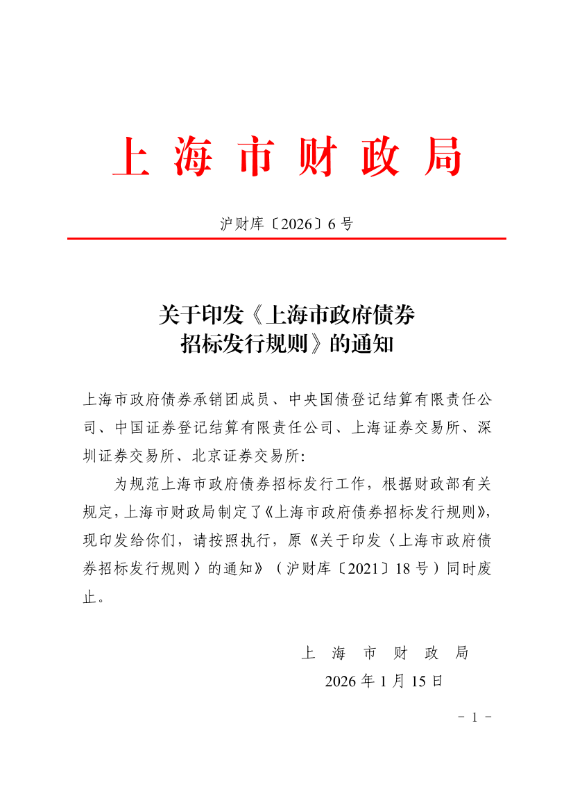 为规范上海市政府债券招标发行工作,根据财政部有关规定,上海市财政局制定了《上海市政府债券招标发行规则》,现印发给你们,请按照执行,原《关于印发〈上海市政府债券招标发行规则〉的通知》(沪财库〔2021〕18号)同时废止。